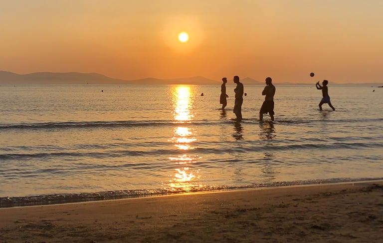 Agios Georgios Beach, near Naxos Town, is a sandy, Blue Flag beach with shallow, calm waters and a family-friendly vibe. Ideal for young children due to its gentle, safe waters, soft sand, and close proximity to Naxos Town. Saint George Beach offers amenities like sunbeds, umbrellas, and nearby family friendly hotels and tavernas.